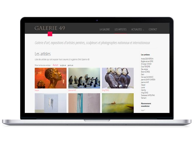Création du site de la galerie d’art Galerie 49, avec mise en avant d’artistes dès la page d’accueil à l’aide d’un diaporama d’images. Classification des artistes par type (peinture, sculpture). Gestion de catégories d’actualités et d’un abonnement à une lettre d’informations pour rester informé des différents salons, expositions et artistes.